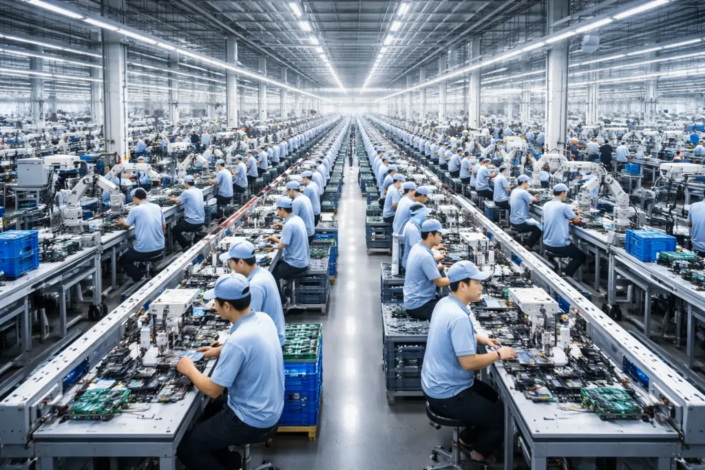 China ha emergido como el principal destino para la deslocalización de la producción debido a sus costos relativamente bajos y su capacidad para escalar rápidamente la producción. Según el Instituto Nacional de Estadística de China, el país representa aproximadamente el 28% de la producción manufacturera mundial. Empresas globales, como Apple y Nike, han establecido vastas operaciones en China para aprovechar sus economías de escala y su infraestructura avanzada.